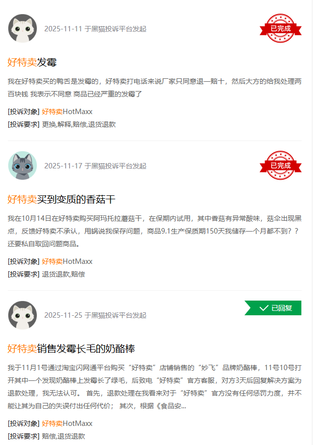 除了价格外,品控问题也成为消费者吐槽的重灾区。21世纪经济报道记者在黑猫投诉平台搜索“好特卖”发现,有大量与产品质量相关的投诉。不少消费者称“好特卖发霉”,购买到“变质的零食”等。