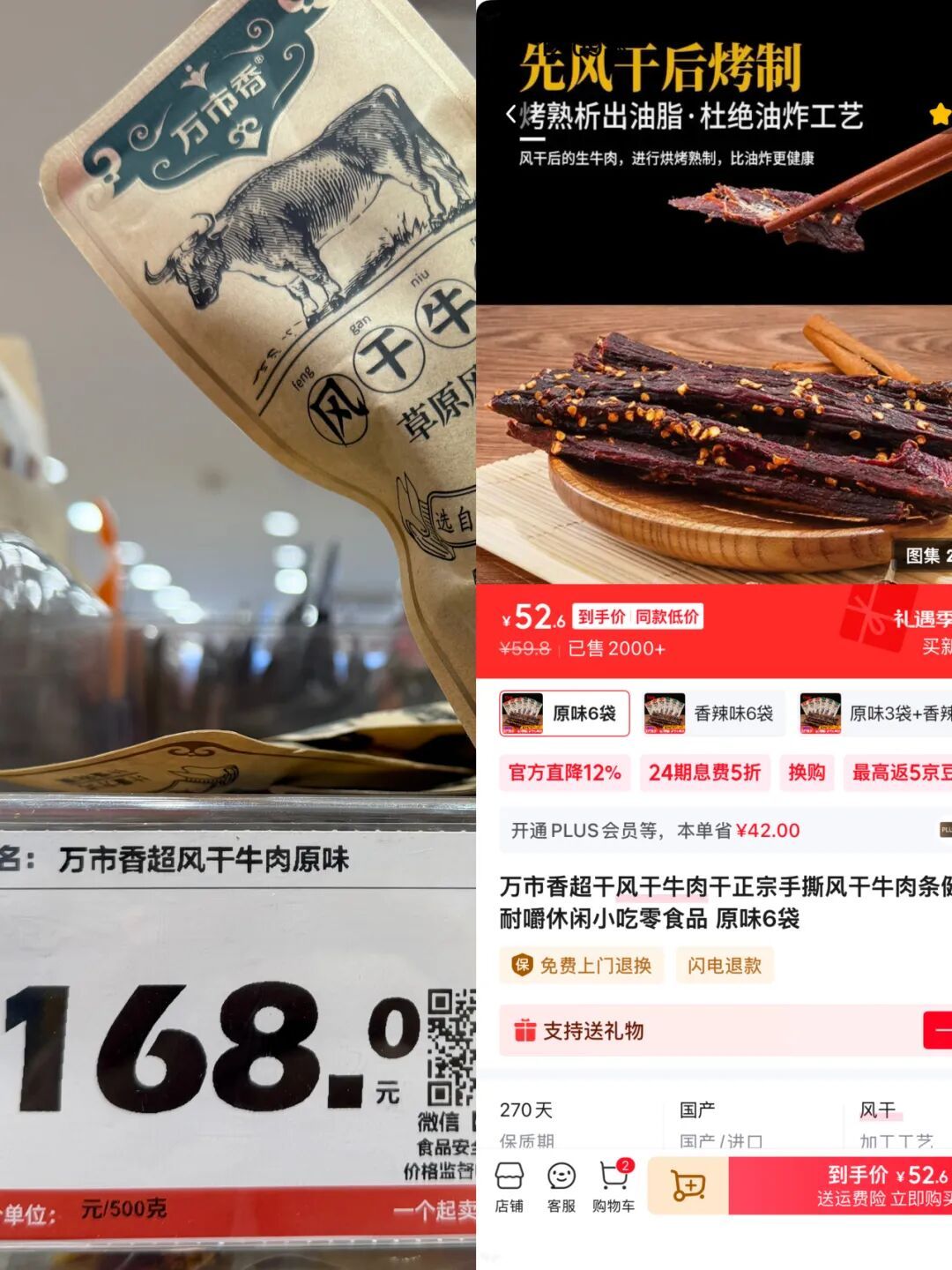 赵一鸣零食一款牛肉干168元/斤,线上同款146元/斤