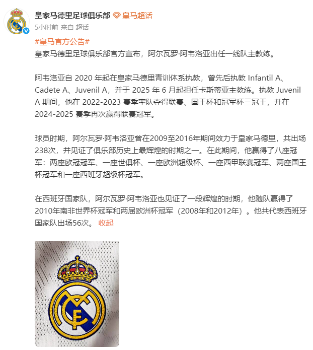 皇家马德里足球俱乐部官方宣布,阿尔瓦罗·阿韦洛亚出任一线队主教练。